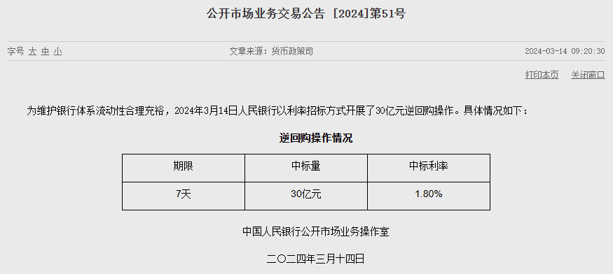 【大河财立方消息】为维护银行体系流动性合理充裕,央行2024年3月14日在公开市场以利率招标方式开展了30亿元7天期逆回购操作股票基础知识入门,中标利率1.80%,与此前持平。数据显示,当日有100亿元逆回购到期,因此单日净回笼资金70亿元。