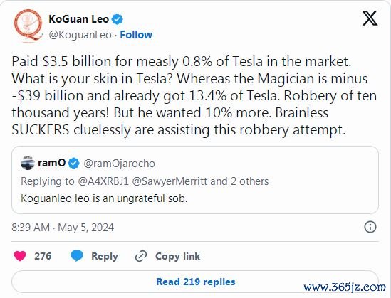 廖凯原在X上发帖称:“花了35亿美元购买了特斯拉0.8%的股份。而魔术师(马斯克)卖了 390亿美元,已经得到了特斯拉13.4%的股份。一万年的抢劫!但他希望再增加10%。没有脑子的笨蛋在协助这次抢劫图谋。”