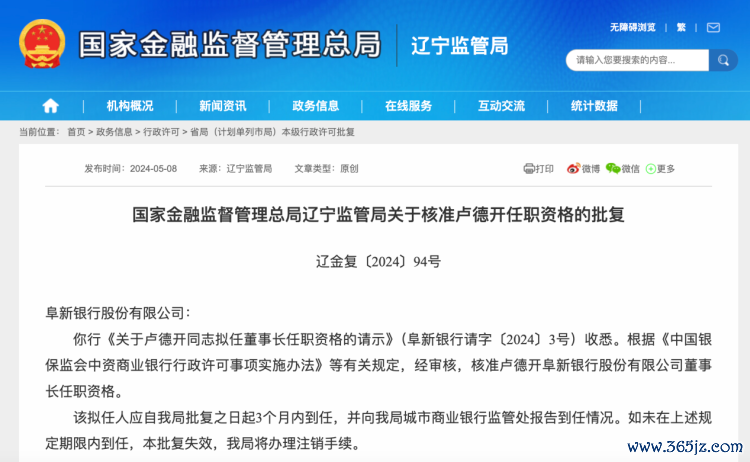 【环球网金融综合报道】5月8日期货十大配资公司,据国家金融监督管理总局辽宁监管局披露,经审核,核准卢德开任阜新银行董事长任职资格。拟任人应自批复之日起3个月内到任,并报告到任情况。